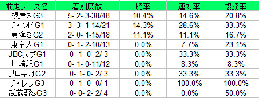 前走根岸組の過去10年は【5.2.3.38】複勝率20.8%ある。